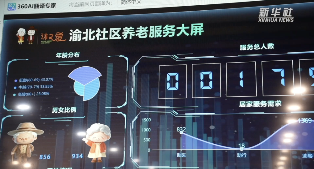 渝北社区老年人人数在1800人左右。这块智慧大屏记录了渝北社区老年人的基础数据,让社区养老基础信息、长者养老服务需求一目了然。