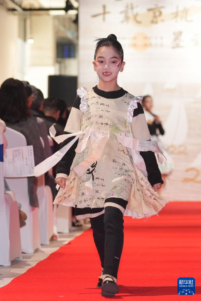 12月19日,杭州市育才京杭小学学生在展示书法创意服装。新华社记者 黄宗治 摄