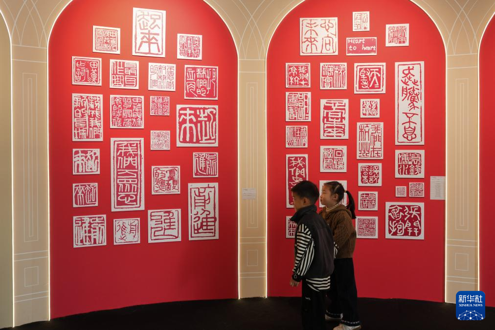 12月19日,小朋友观看杭州市育才京杭小学毕业生篆刻作品。新华社记者 黄宗治 摄