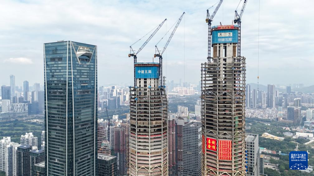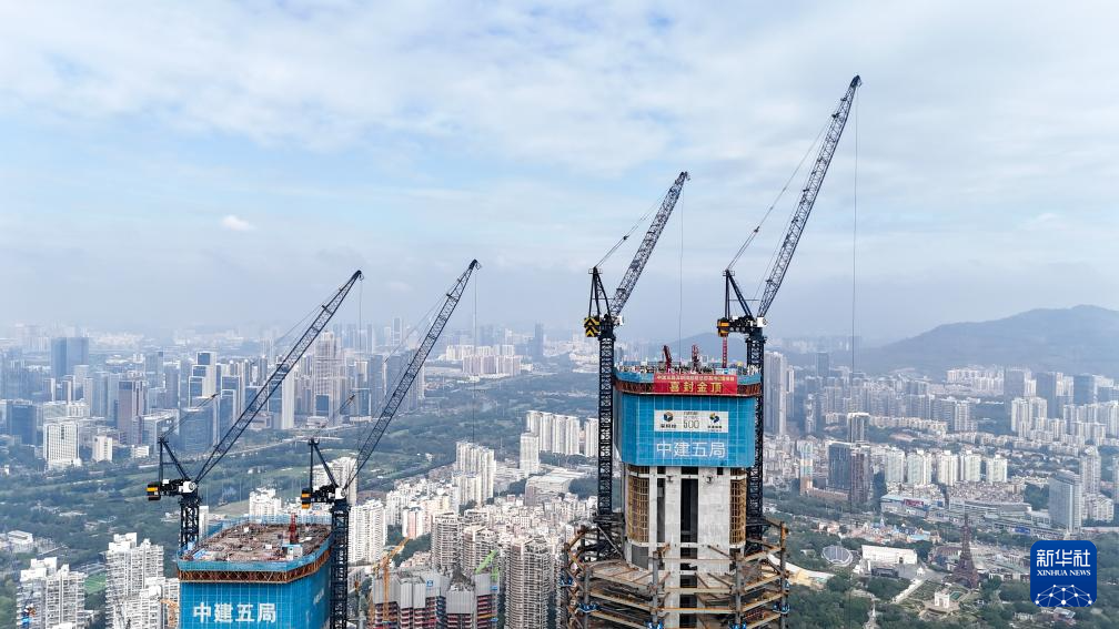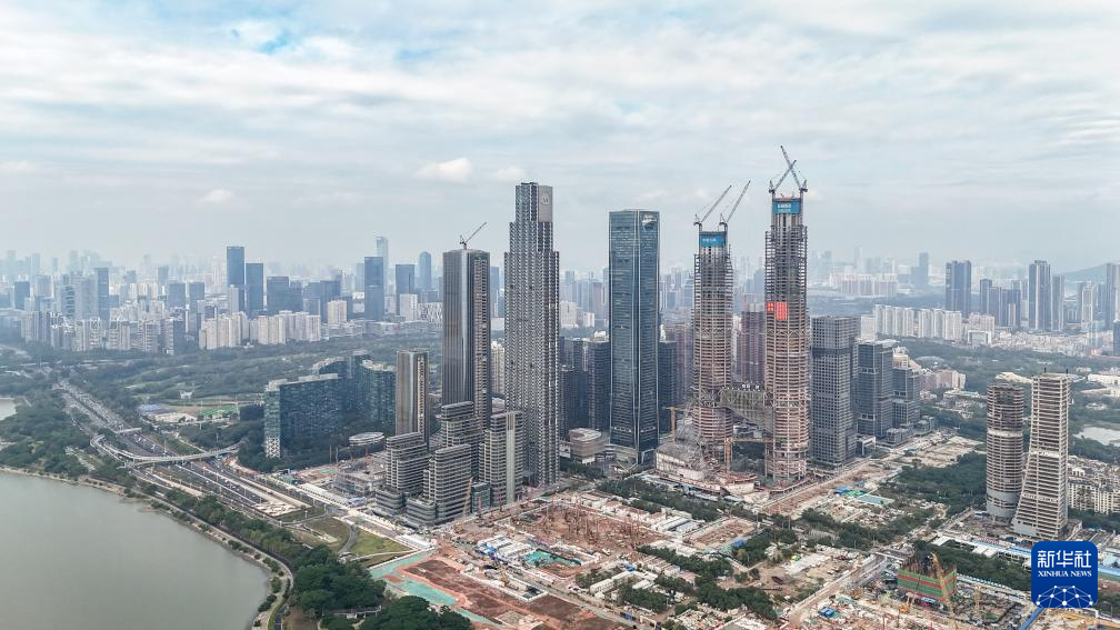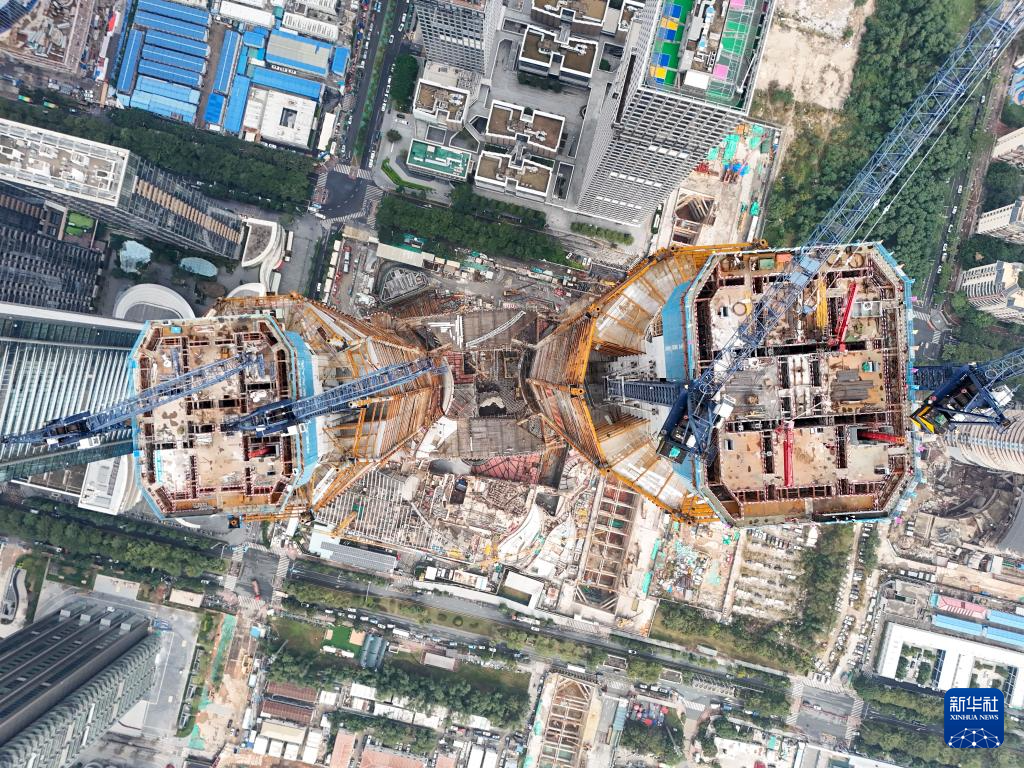 这是12月19日拍摄的深圳湾超级总部基地C塔项目主体结构封顶施工现场(无人机照片)。新华社记者 梁旭 摄