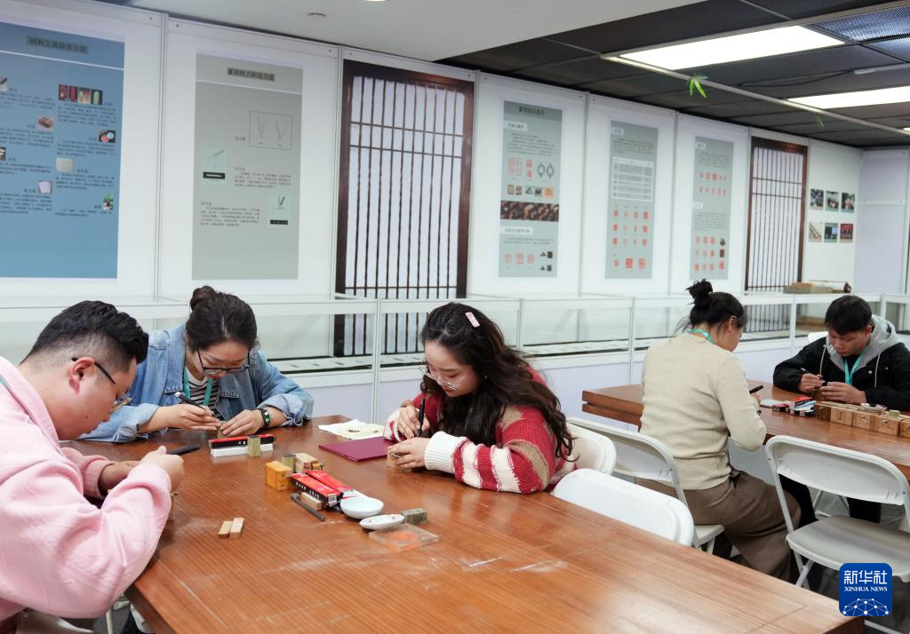 12月19日,在篆刻工作坊,参展学生在进行篆刻展示。新华社记者 刘颖 摄