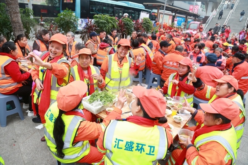 这场主题为“暖冬磁器口·致敬劳动者”的大型公益主题活动由慈善爱心人士张世文发起。他是沙坪坝区人大代表、曾获得过“全国优秀农民工”“重庆好人”等殊荣。从2002年开始,每年冬至时节,他都会精心准备一场爱心“坝坝宴”。如今,张世文的这一爱心举动已坚持了整整21年,有近两万名环卫工人参加聚餐活动。