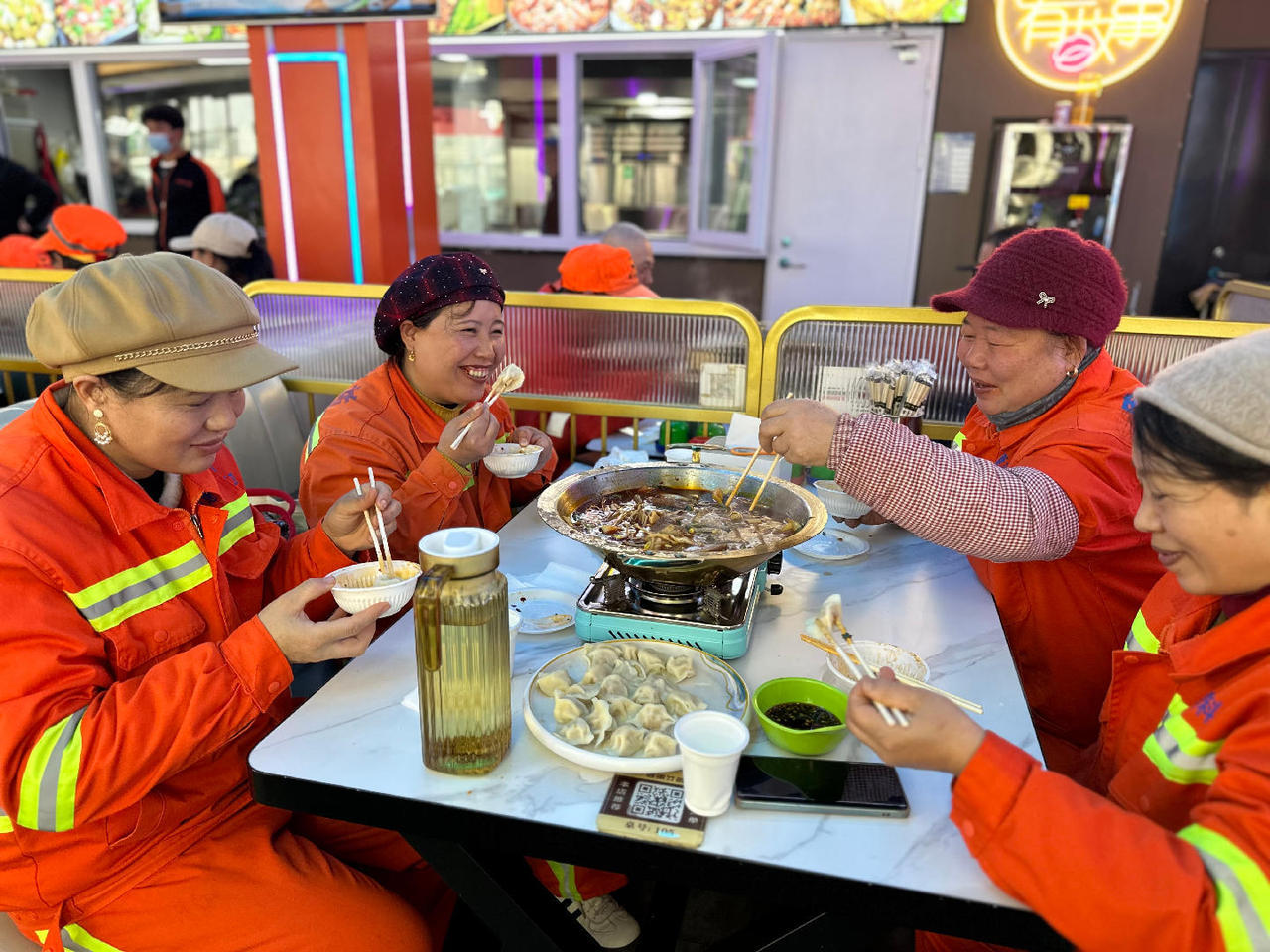 结束上午清扫工作的环卫工人陆续来到店里,店员们立刻递上一碗碗热饺子。王师傅接过饺子,咬了一口,眼睛笑得弯成了月牙:“这饺子比我家包的还香!以前冬至都是在路边买个包子对付,今天能和几十个工友一起吃饺子,感觉跟过年似的。”