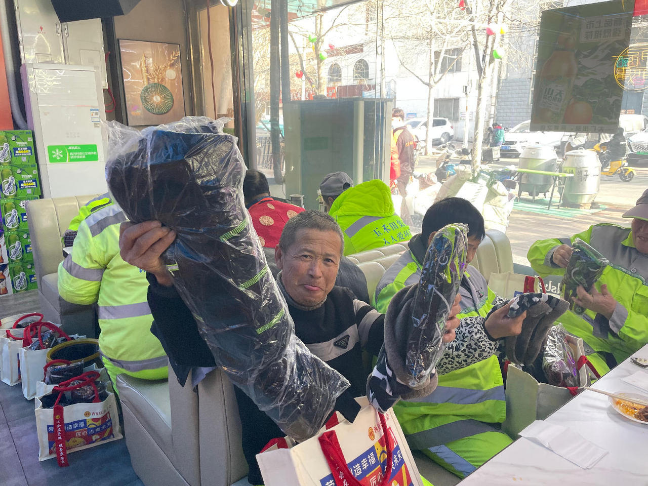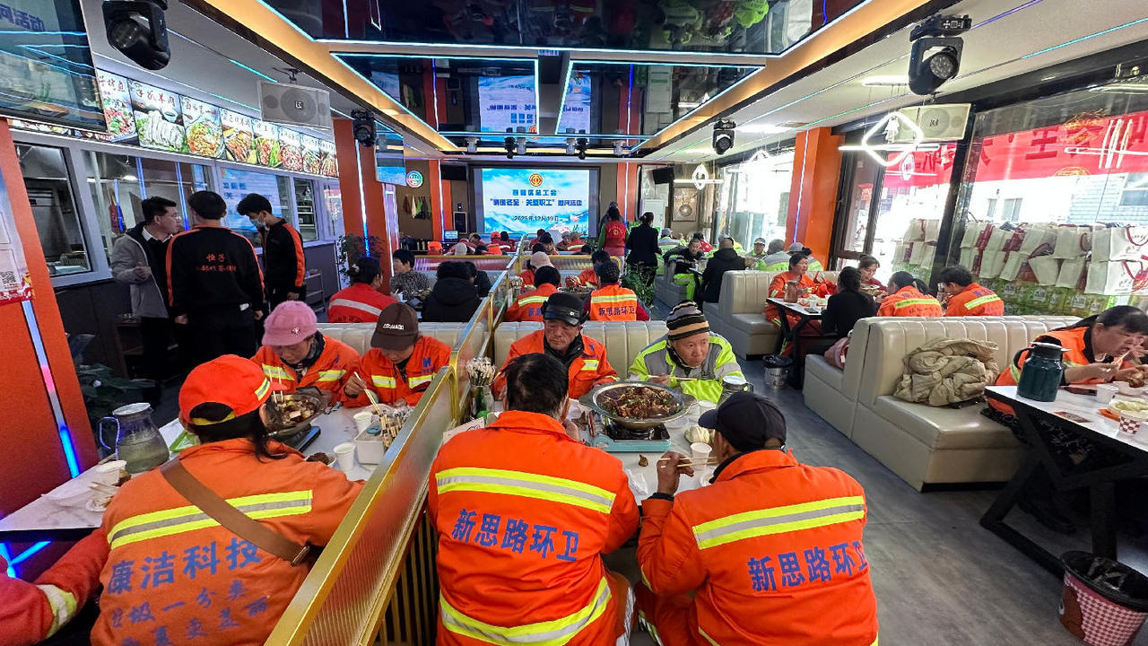 100名坚守一线的环卫工人围坐一起,吃饺子、羊蝎子牛排涮锅。席间,工会工作人员为他们逐一送上暖冬大礼包,内含加绒手套、保暖护膝、围脖等保暖用品。李大姐反复摩挲着新护膝,向工作人员道谢:“谢谢工会对我们的关心,这护膝刚好能护着膝盖,我有老寒腿,冬天扫街最怕冷,这个礼物来得太及时了!”