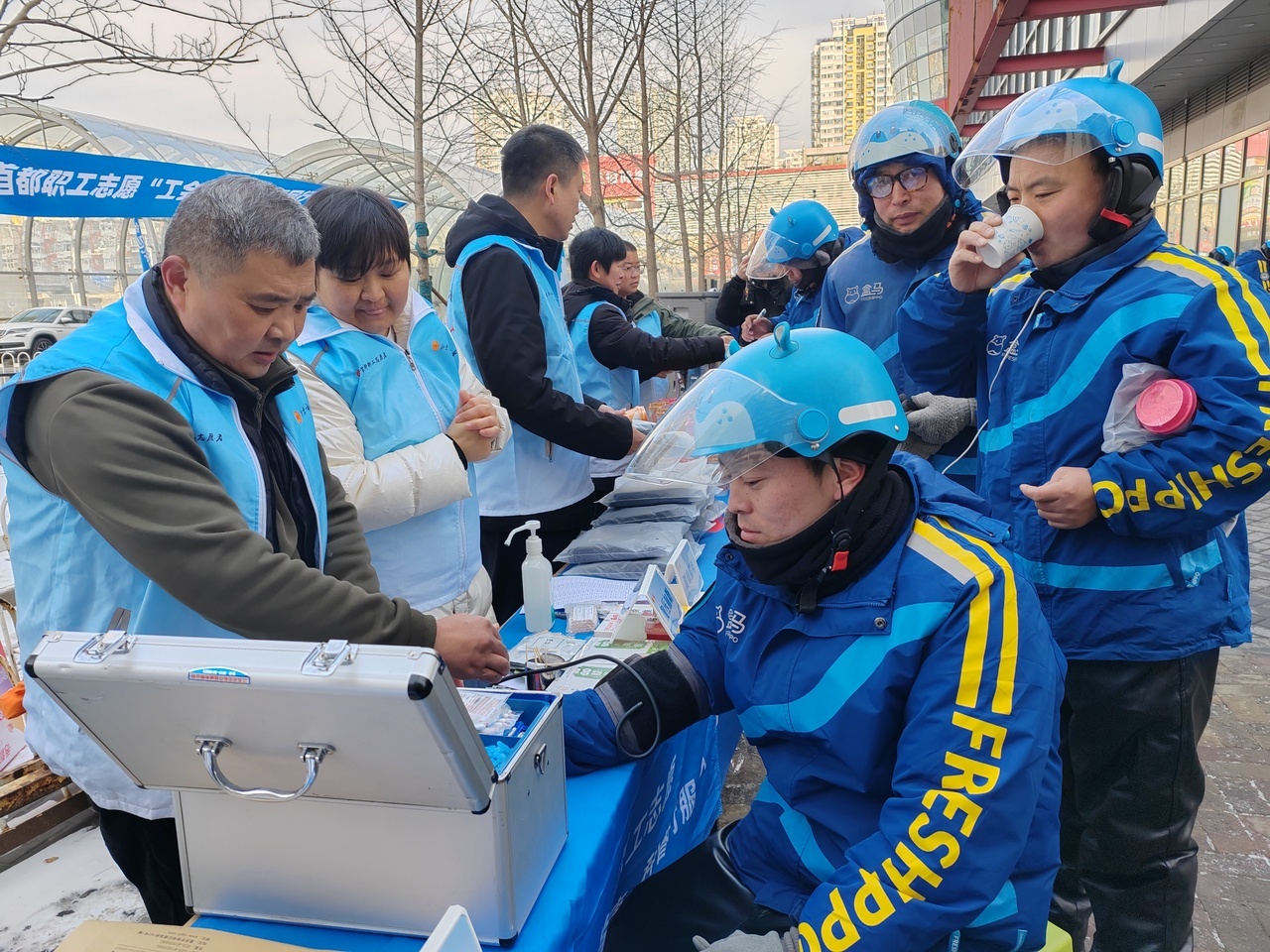 一名在现场接受健康服务的盒马配送小哥,深受现场氛围感召,主动从“被服务者”转变为“服务提供者”,投身到服务他人的行列。