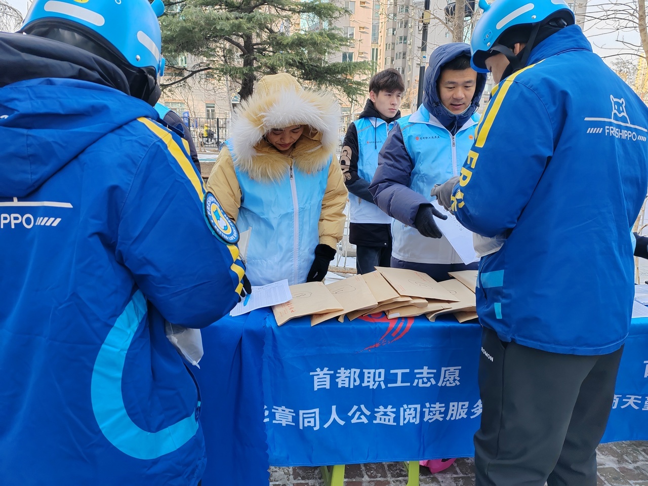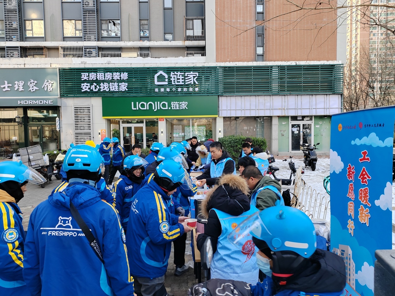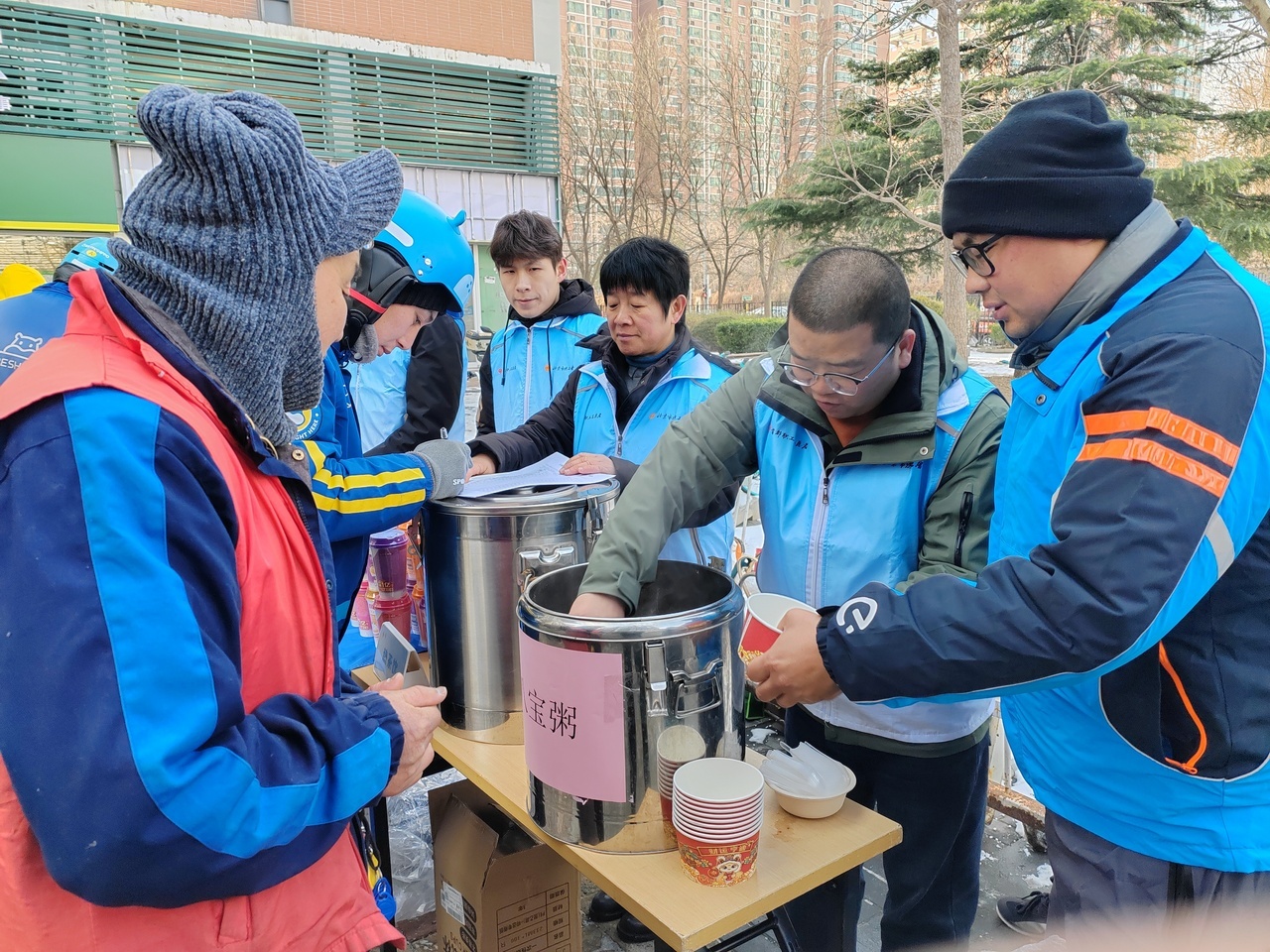 面对近期寒潮天气,工会的关怀举措精准及时,温暖人心。一方面,针对户外作业的实际困难,工会为相关劳动者精准发放围脖、帽子等防寒保暖物资,切实解决急难所需。另一方面,在全国劳动模范梁会兰的感召下,志愿者们于清晨时分熬制并送上热气腾腾的八宝粥和姜糖水,将实实在在的温暖递到寒风中奔波的劳动者手中。