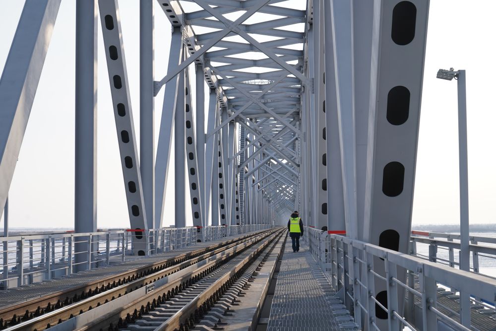 12月6日,在俄罗斯犹太自治州下列宁斯阔耶,俄方人员在跨越阿穆尔河(黑龙江)的同江-下列宁斯阔耶铁路大桥上巡视。新华社记者 刘恺 摄