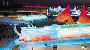 喷吐蒸汽的冰雕火车与现代感十足的动车冰雕交相辉映。哈尔滨日报记者 刘洋摄