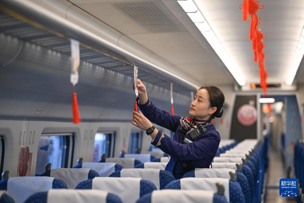 12月23日,列车员在即将由包头站发车的D4667次动车组列车上布置车厢。新华社记者 李志鹏 摄