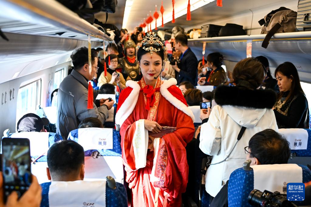 12月23日,工作人员(中)在D4667次动车组列车上与旅客互动。新华社记者 李志鹏 摄