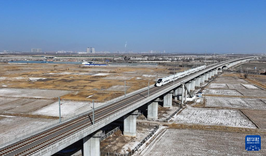 12月23日,包银高铁D4668次动车组行驶在石嘴山境内(无人机照片)。新华社记者 王鹏 摄