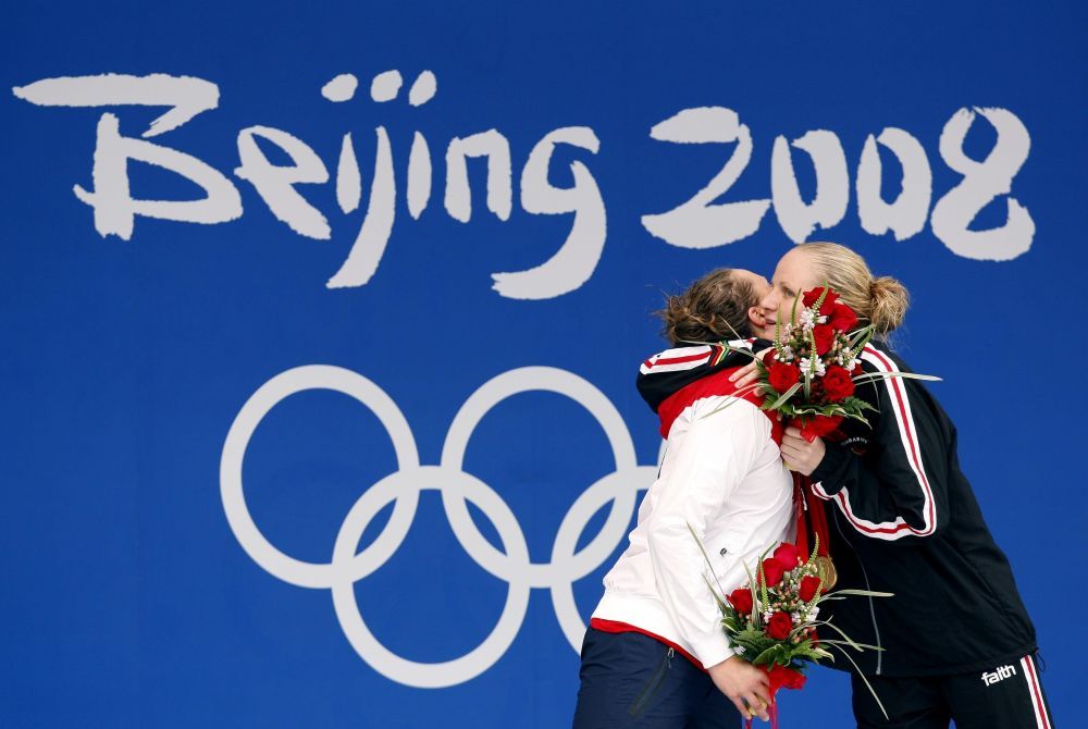2008年8月16日,考文垂(右)在北京奥运会女子200米仰泳决赛中打破世界纪录并夺得冠军后接受祝贺。新华社记者 费茂华 摄