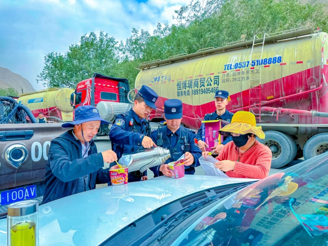 7月7日,219国道187公里处被泥石流截断,车辆滞留在侧。派出所民警赶到时,轰鸣的机械正清理路面,而他们迅速展开另一场“补给战”:一人抱着一箱泡面,一人提着热水壶,还有一人左手纸杯、右手喇叭,向着等候的人群走去——“大家别急,我们正在全力抢通!需要泡面热水的来这边,需要药品氧气的找医生,车有故障的,阿布都克热木师傅马上到!”