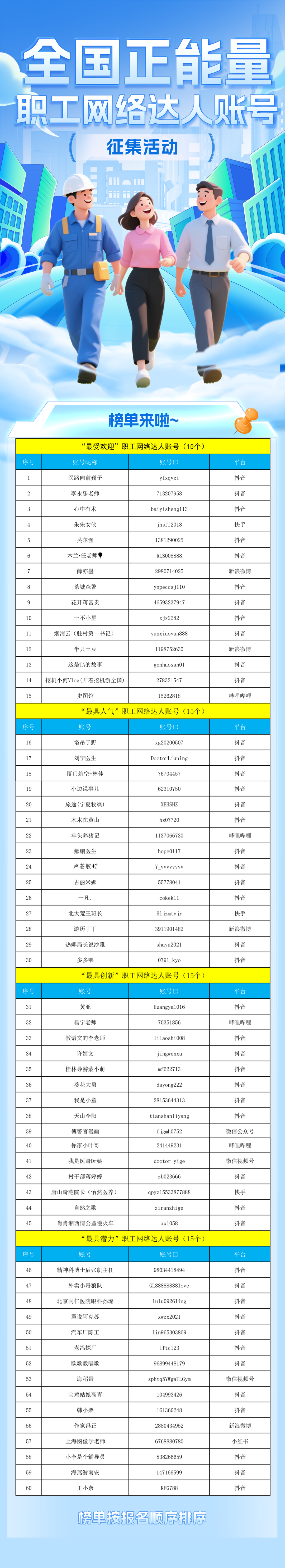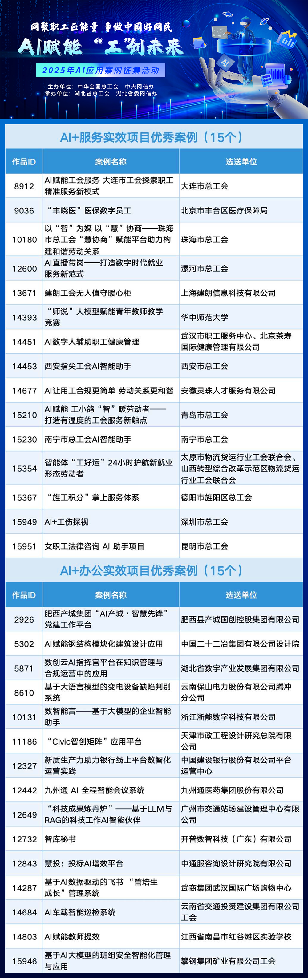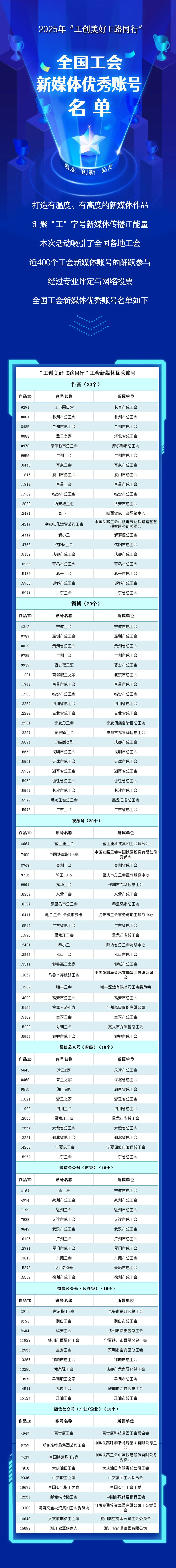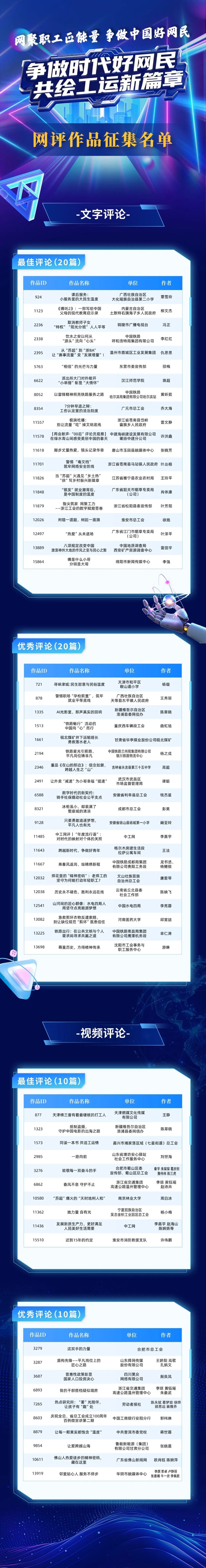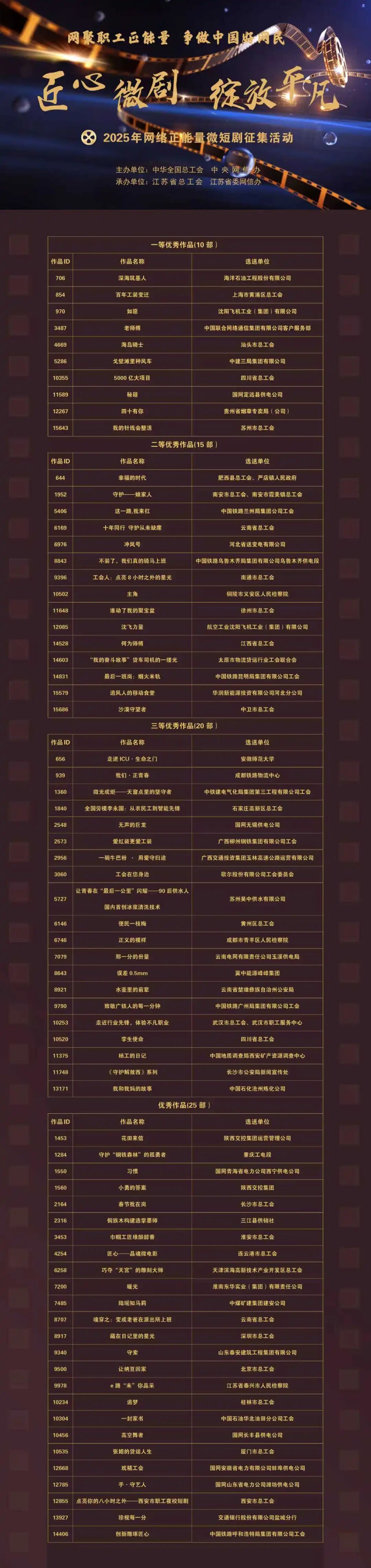 2025年主题活动坚持以习近平新时代中国特色社会主义思想为指导,按照中国工会十八大工作部署,充分展现广大职工建功“十四五”、奋进新征程的时代风采,充分发挥工人阶级主力军作用,结合庆祝中华全国总工会成立100周年,深入开展网络正能量歌曲、微短剧、动漫、摄影、诵读、职工网络达人账号、网评作品、工会新媒体账号、AI应用案例、创新活动等10个示范性系列征集活动,征集数量和投票总数双创新高,共征集各类作品和案例1.5万余件,网民参与终选投票6600万余次。“争做好网民”的理念得到广泛传播,职工好网民的声音持续放大,中国好网民的正能量更加强劲。经过初筛、网络投票、专家评审、公示等环节,共评选出歌曲100首、微短剧70部、动漫作品76部、摄影作品120幅、诵读作品100部、职工网络达人账号60个、网络评论作品60件、工会新媒体账号100个、AI应用案例30个、创新活动120项。