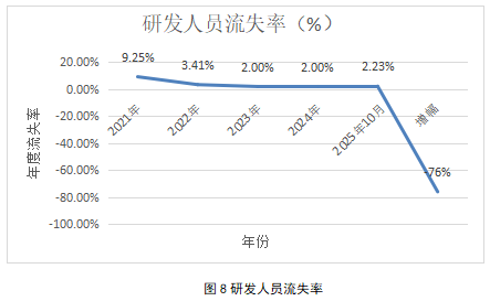 3.组织健康度持续增强:研发人员流失率从2021年9.25%降至2025年2.23%,增幅达-76%;在“十三五”、“十四五”时期,新增院士级顶尖人才、国家级专家人才与创新团队数量由11人增长至31人,增长率为181.82%;授权专利从“十三五”时期的97份增长至“十四五”时期的329份,增长率为239.18%。这充分证明了人文关怀系统对稳定队伍、提升归属感、创造价值的作用。