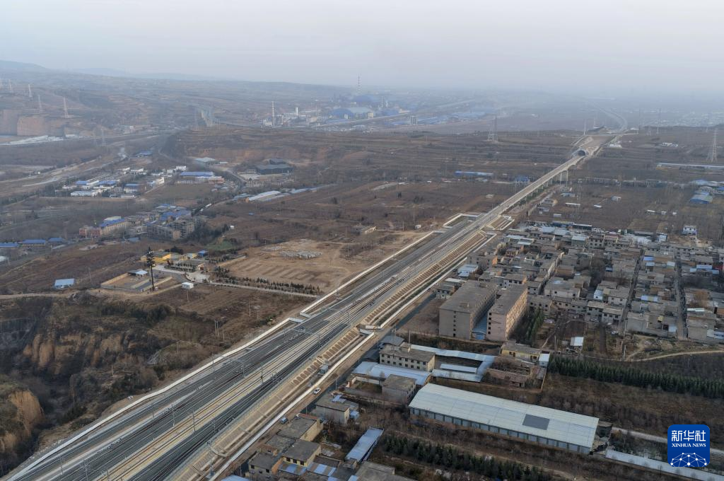 12月24日拍摄的西延高铁铜川段(无人机照片)。新华社记者 邢广利 摄