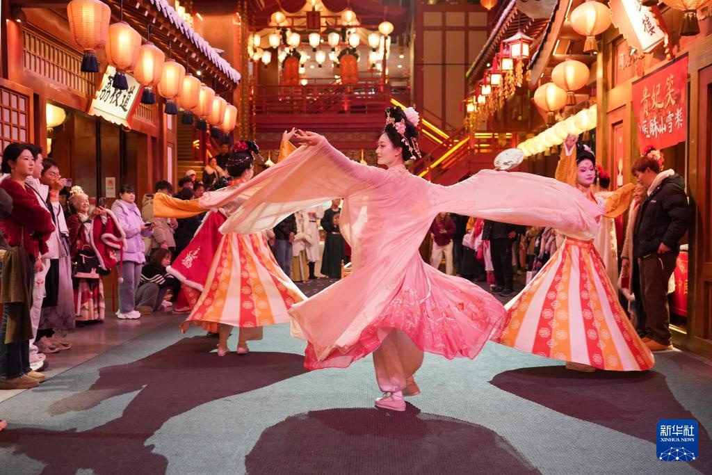 12月23日,演员在街区内表演大唐乐舞《霓裳羽衣舞》。新华社记者 邵瑞 摄