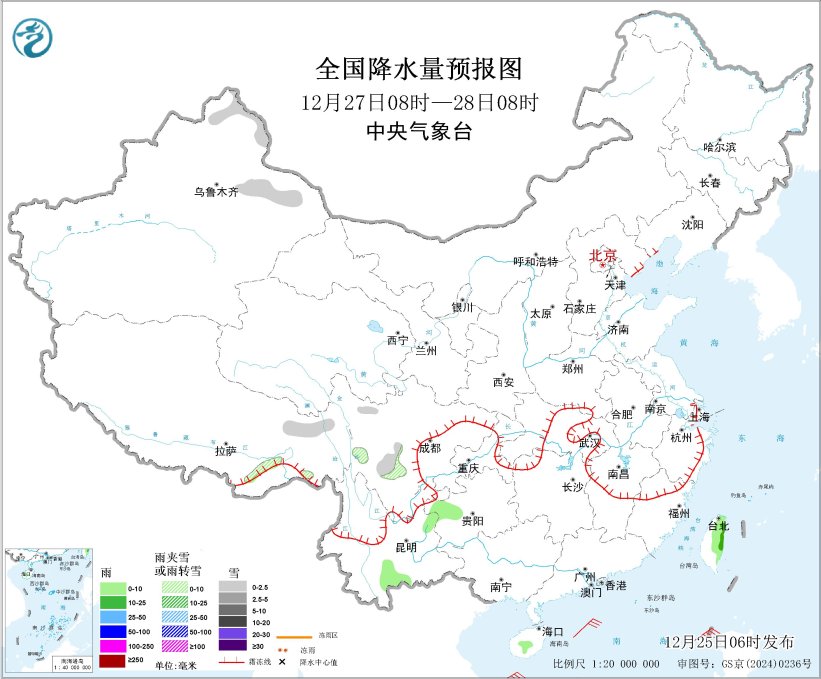 12月27日08时至28日08时,新疆北疆北部和东部、西藏东部、川西高原南部等地部分地区有小雪或雨夹雪。贵州中西部、云南南部、海南岛中部、台湾岛等地部分地区有小雨,其中,台湾岛东部等地部分地区有中雨。巴士海峡、南海东北部海域将有5~7级、阵风8级的东北风,台湾海峡、南海中部和西北部海域将有5~6级、阵风7级的东北风。