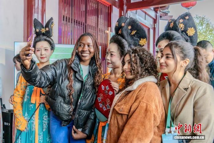 10月17日,河南洛阳,身穿特色服饰的工作人员吸引外宾合影。记者 李超庆 摄