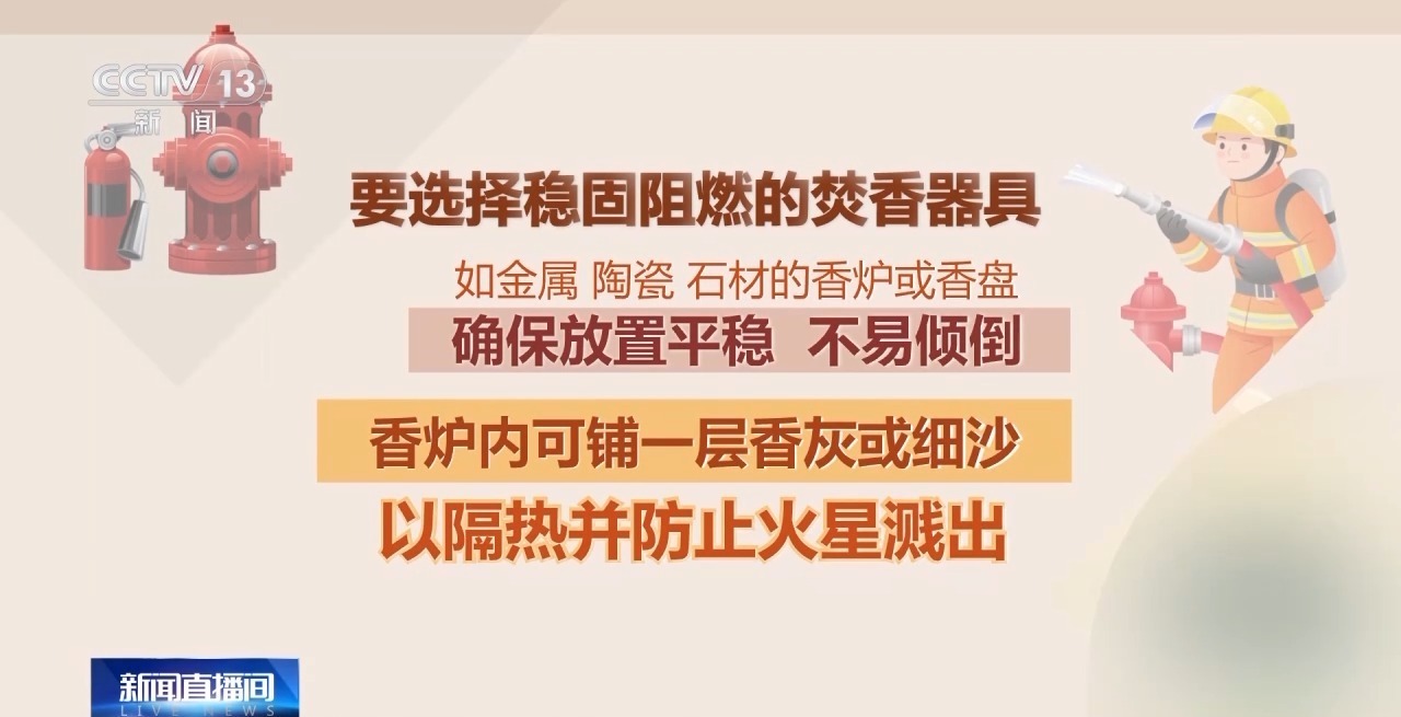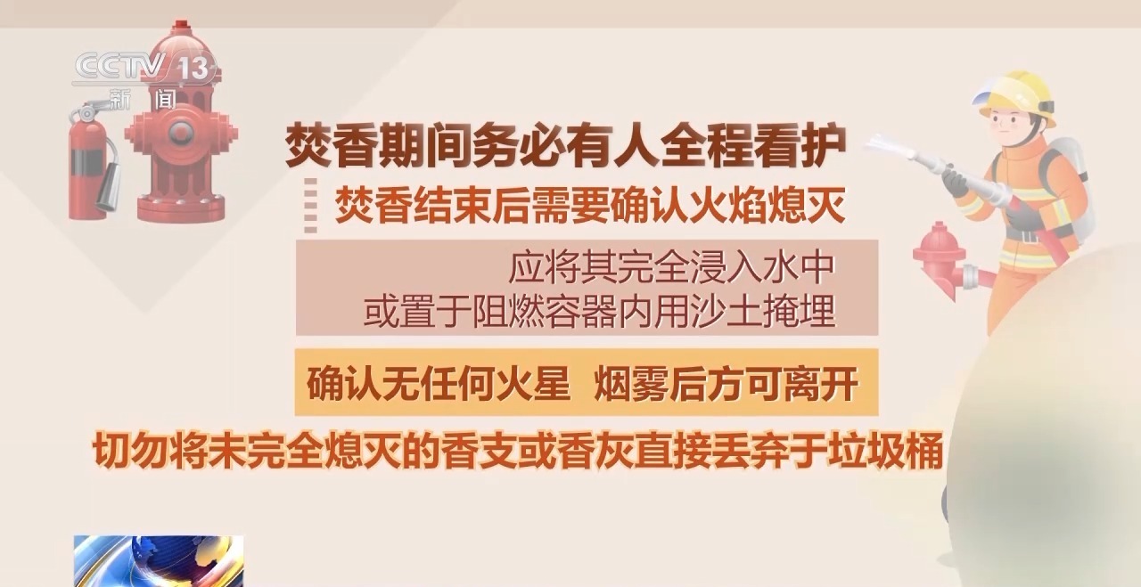 消防员告诉记者,焚香时香烛顶端的小火芯温度可以达到500摄氏度,所以一定要注意远离一切可燃物,同时火不离人全程看护,一起来看安全提示。