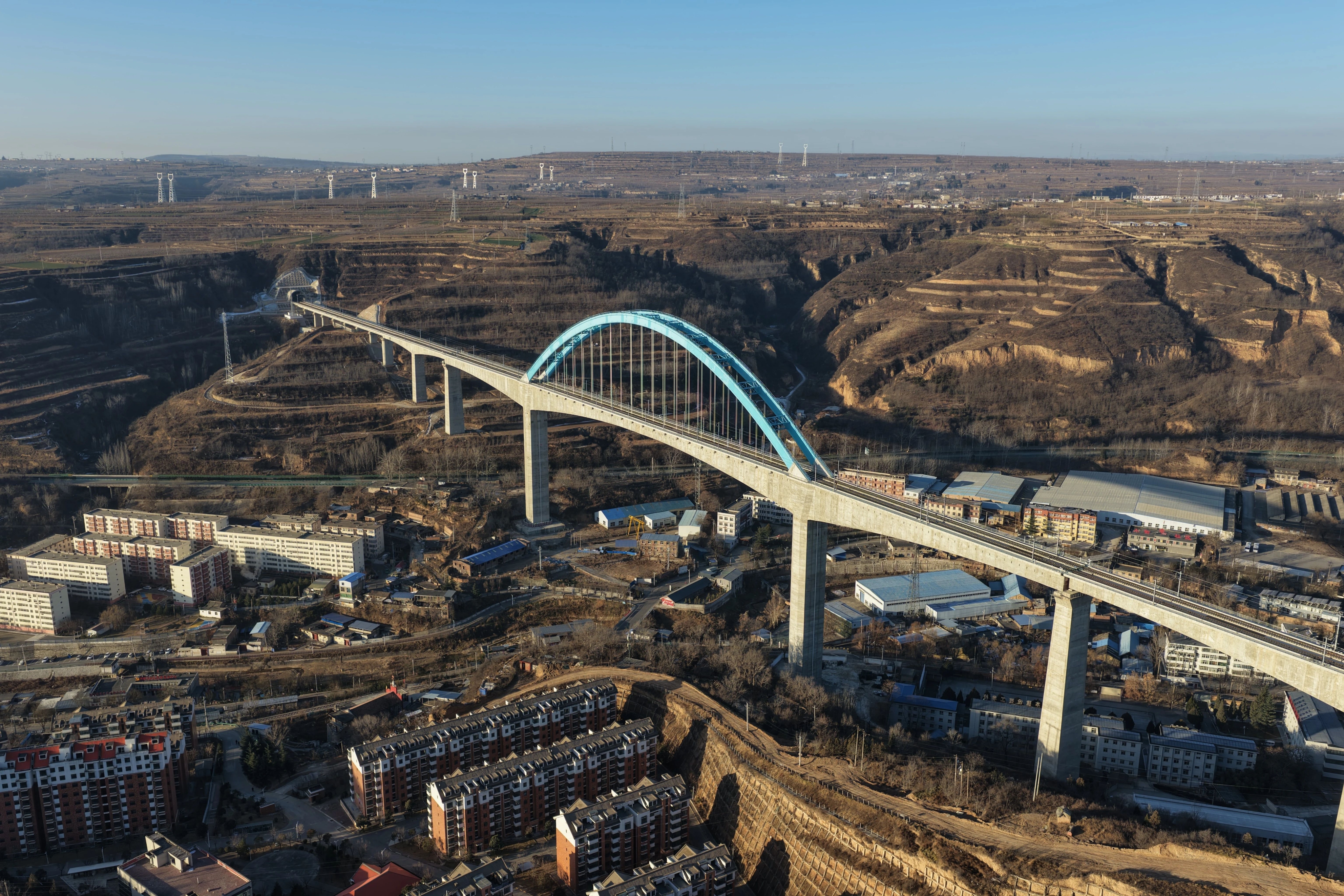 西安至延安高速铁路关键控制性工程王家河特大桥位于陕西省铜川市王益区,是西延高铁全线跨度最大、高度最高的桥梁。桥梁全长1066米,其主跨采用248米连续刚构加拱组合结构,桥面距沟底高达105米,是国内高速铁路无砟轨道桥梁中同类型结构的跨度与高度双项纪录保持者,对保障西延高铁全线贯通具有决定性意义。