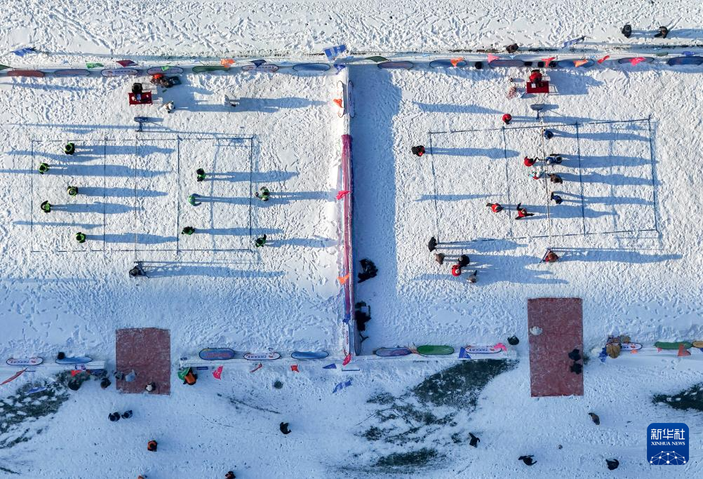 12月25日,人们在2026第八届哈尔滨松花江冰雪嘉年华园区内体验冰上排球(无人机照片)。新华社记者 王松 摄