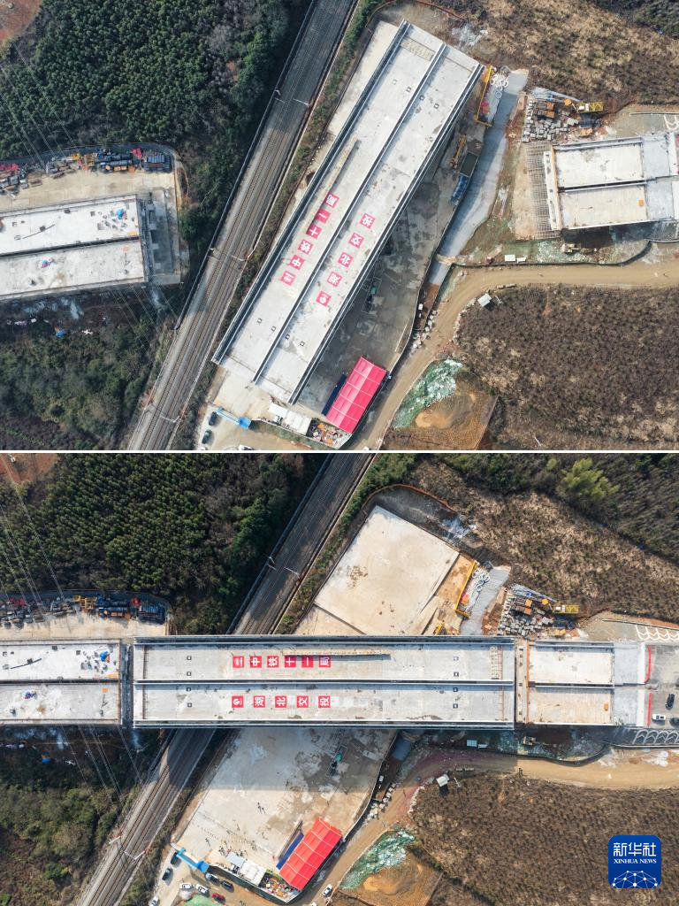 拼版照片:这是12月25日拍摄的转体桥施工现场(无人机照片)。新华社记者 伍志尊 摄