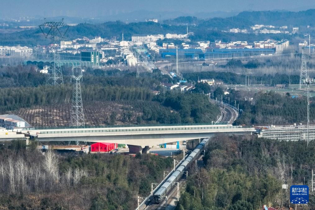 12月25日,桥体顺利完成转体后,列车从桥体下方驶过(无人机照片)。新华社记者 伍志尊 摄