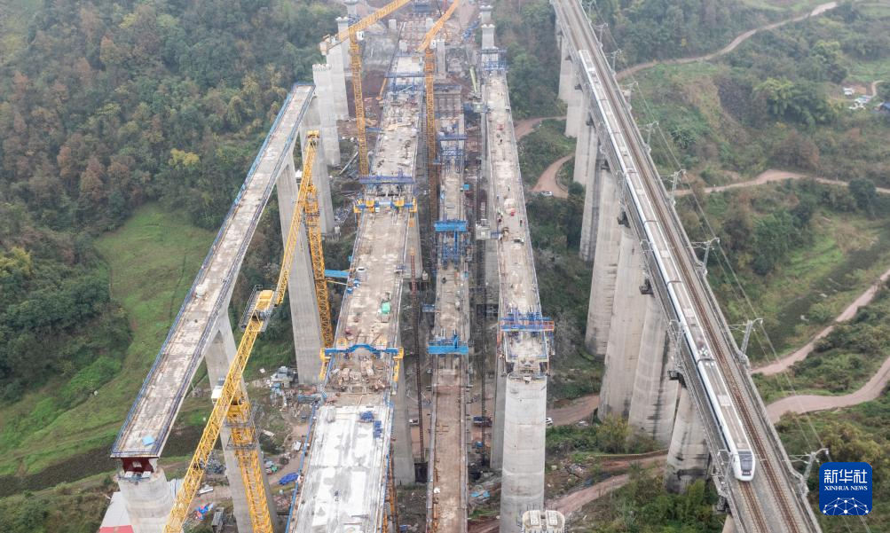 这是12月25日拍摄的渝万高铁打青沟左线大桥连续梁(右二)建设现场(无人机照片)。新华社记者 陈诚 摄
