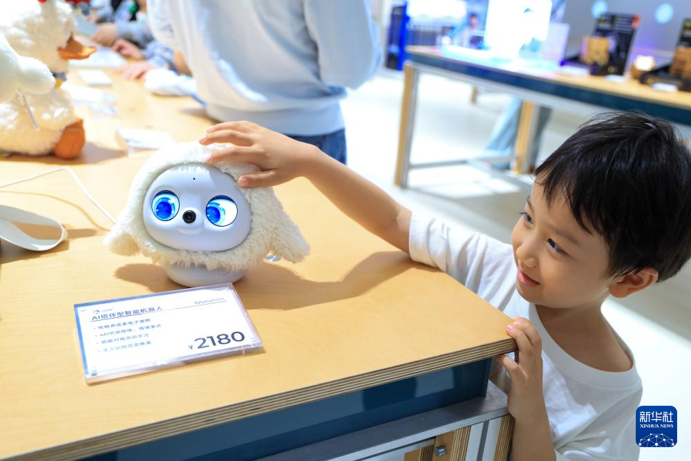 12月21日,在位于深圳的全球创新旗舰店inno100,一名儿童与AI玩具Ropet互动。新华社记者 毛思倩 摄