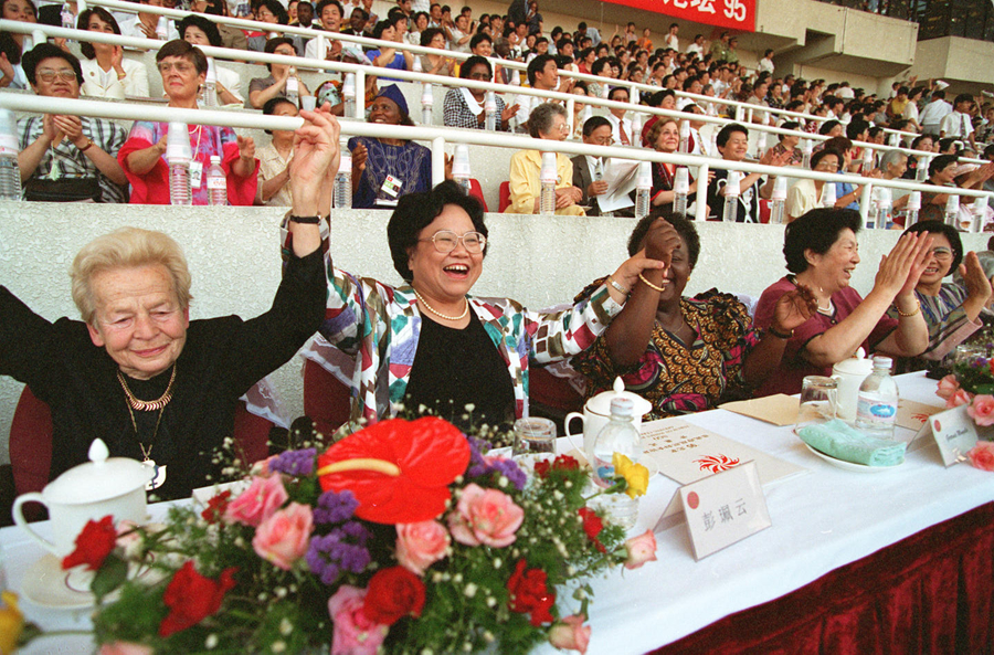 1995年8月30日,九五北京非政府组织妇女论坛在北京国家奥林匹克体育中心体育场开幕。这是彭珮云同志出席开幕式。新华社记者 罗更前 摄