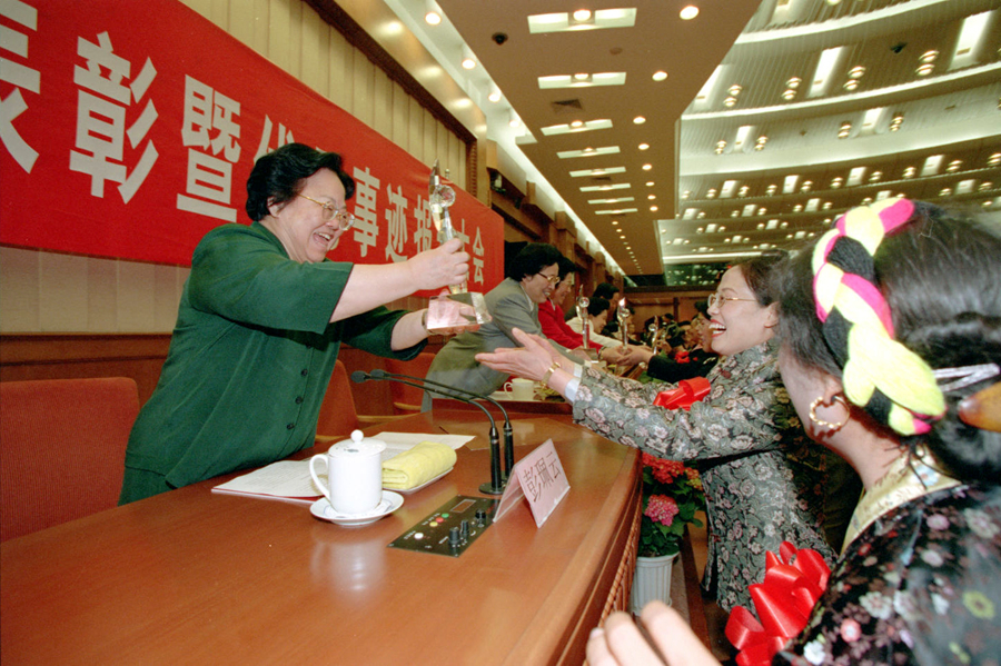2001年5月12日,“中国十大杰出母亲”表彰暨事迹报告会在北京举行。这是彭珮云同志为获得首届“中国十大杰出母亲”荣誉称号的母亲颁奖。新华社记者 鞠鹏 摄