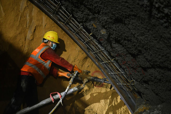 2022年4月25日,工人在位于延安市洛川县的西延高铁洛川隧道施工。新华社记者 张博文 摄