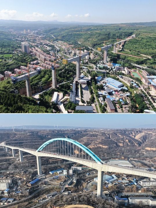 拼版照片:上图为施工中的西延高铁王家河特大桥(2023年7月22日摄,无人机照片);下图为一列试运行列车从西延高铁王家河特大桥驶过(2025年12月10日摄,无人照片)。新华社记者 张博文 摄
