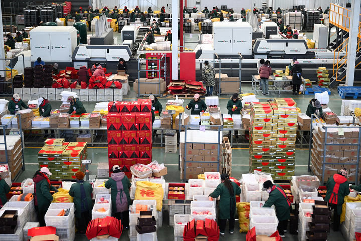 2025年1月6日,在陕西延安市洛川县一家果业企业,工作人员在生产线工作。新华社记者 张博文 摄