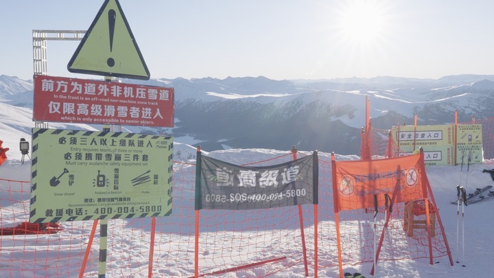 禾木吉克普林雪场道外区域入口处的安全提示及防护网。雪崩风险高时,该区域入口封闭。新华社记者 卢星吉 摄