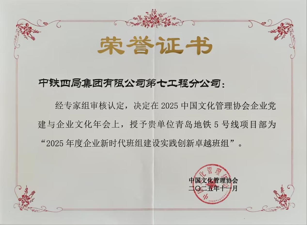 “基础不牢,地动山摇”。在中铁上投青岛地铁5号线土建二标02工区中铁四局施工现场,班组不仅是施工的“细胞单元”,更成为项目提质增效的“创新引擎”。该工区项目部以“2345工作法”为核心,通过党建创新与制度建设双轮驱动,推动班组建设走深走实,不仅实现“效益、效率双提升”,更荣获中国文化管理协会“2025年度企业新时代班组建设实践创新卓越班组”称号。