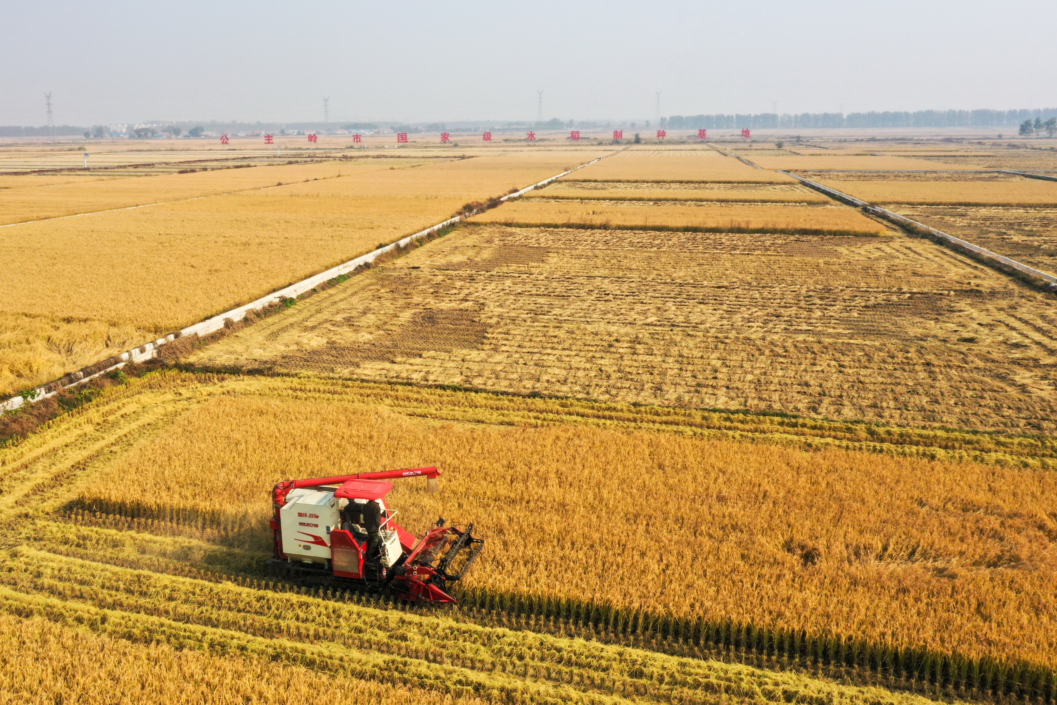 2025年10月14日,在吉林省公主岭市,农民驾驶农机收割水稻(无人机照片)新华社记者 张楠 摄