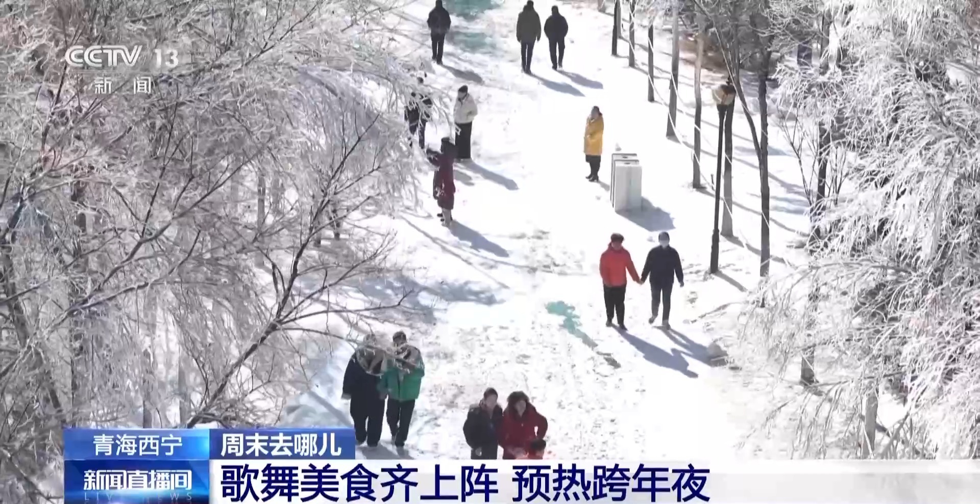 总台记者程河源介绍,漫步在青唐城的雾凇景观街道上,道路两侧的树木被洁白的冰晶层层包裹,玉树琼花、银装素裹,阳光洒落时,反射出斑斓光影。