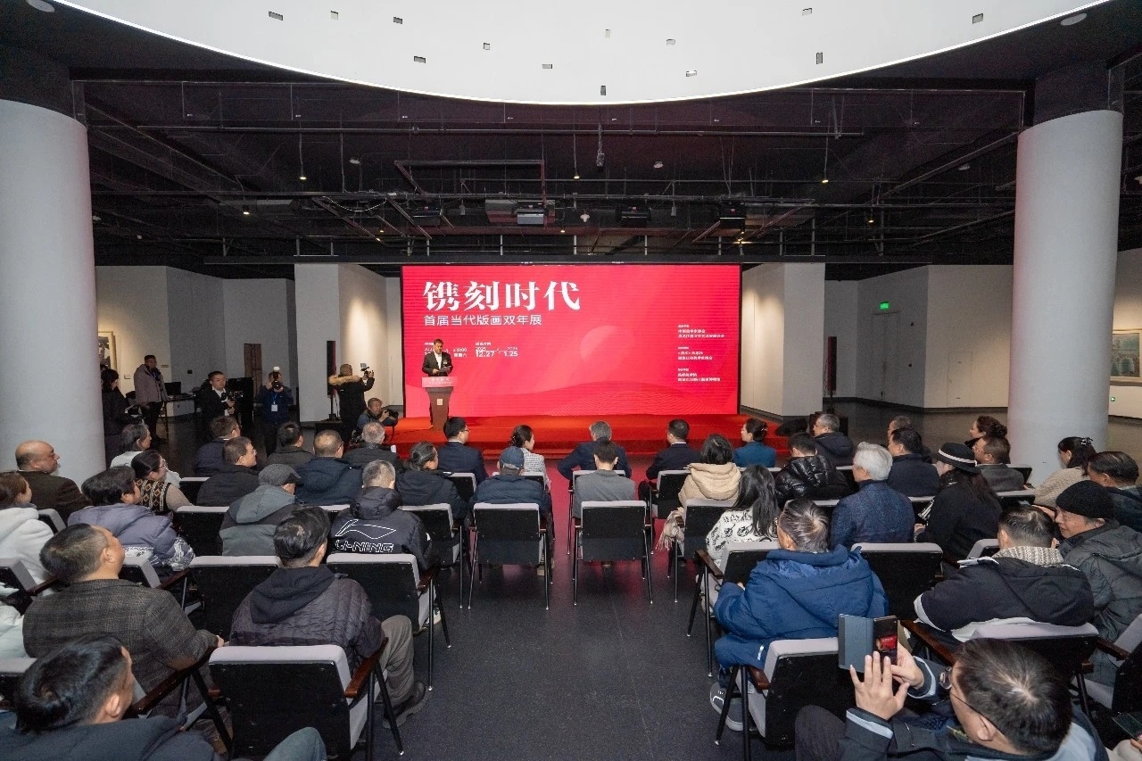 开幕式现场,巨幅主题背景板“镌刻时代”四字苍劲有力,与展厅内近两百幅版画精品相映生辉。来自全国各地的版画艺术家、评论家、学者400余人齐聚一堂,共同见证这一艺术盛事。