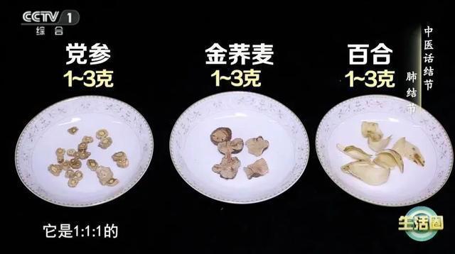百合、党参、金荞麦,各取1~3克,用热水冲泡饮用,能够舒缓不良情绪、补肺气、散结,适合肺结节人群饮用,也可以用于预防肺结节发生。