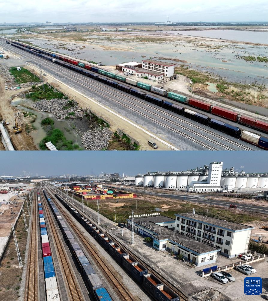 拼版照片:上图为钦州港港口作业区,工程车在进行铺设轨道石砟作业(2019年6月26日摄,无人机照片),下图为钦州港港口作业区装运集装箱的场景(2023年5月11日摄,无人机照片)。新华社记者 张爱林 摄