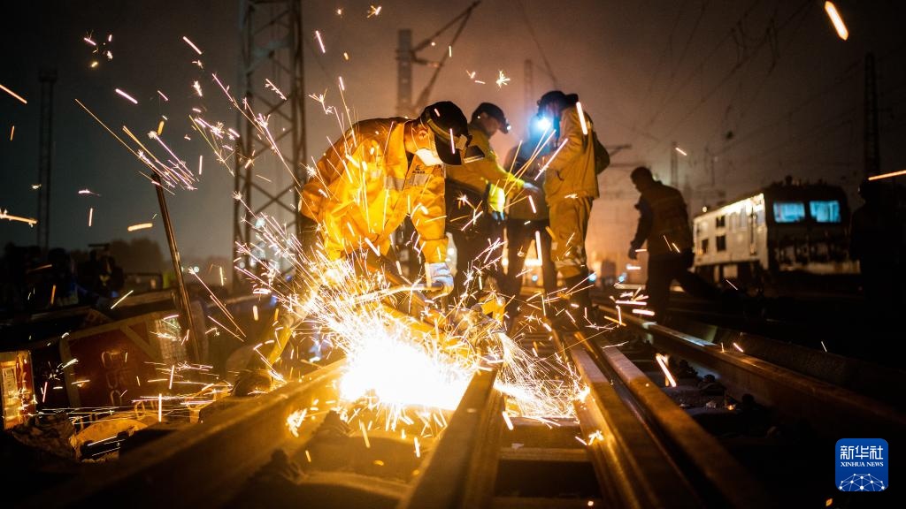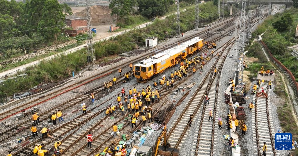 这是铁路工人在西部陆海新通道的铁路轨道上更换钢轨(2023年4月12日摄)。新华社记者 张爱林 摄