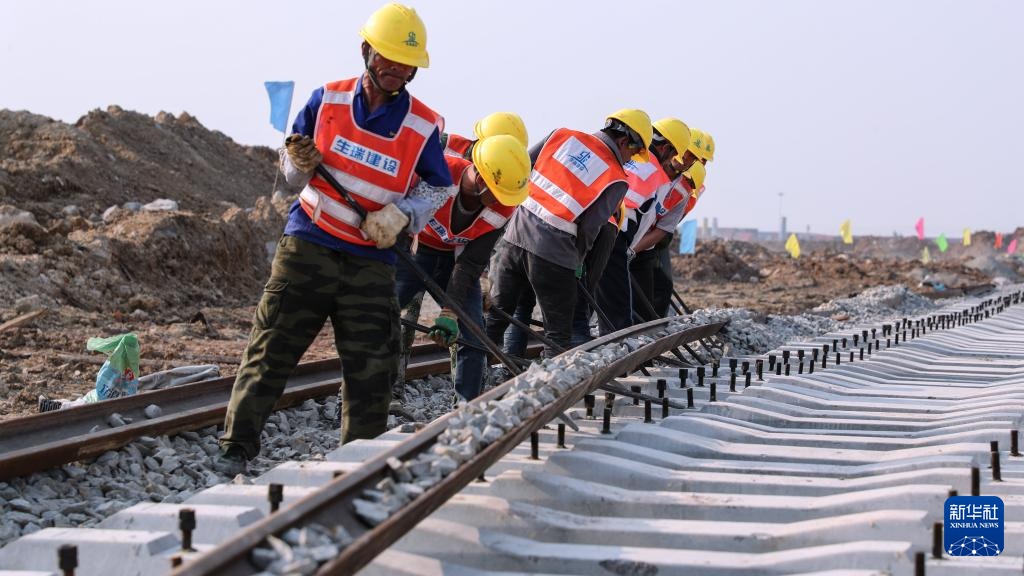 这是铁路工人在钦州港东站扩建工程工地铺设钢轨(2019年3月11日摄)。新华社记者 张爱林 摄