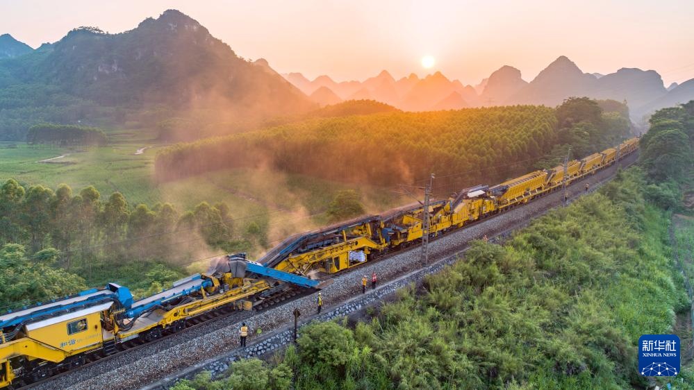 这是大机在西部陆海新通道的铁路轨道上进行清筛作业(2024年5月24日摄,无人机照片)。新华社记者 张爱林 摄