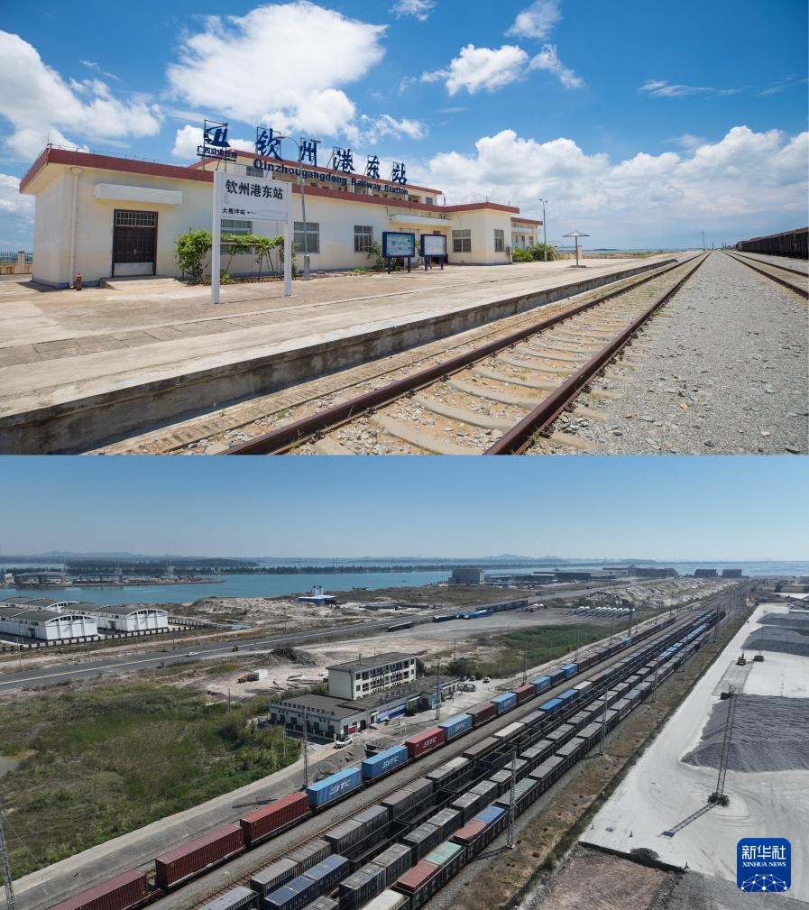 拼版照片:上图为2018年7月19日拍摄的钦州港东站,下图为如今的钦州港东站(2025年12月27日摄,无人机照片)。新华社记者 张爱林 摄