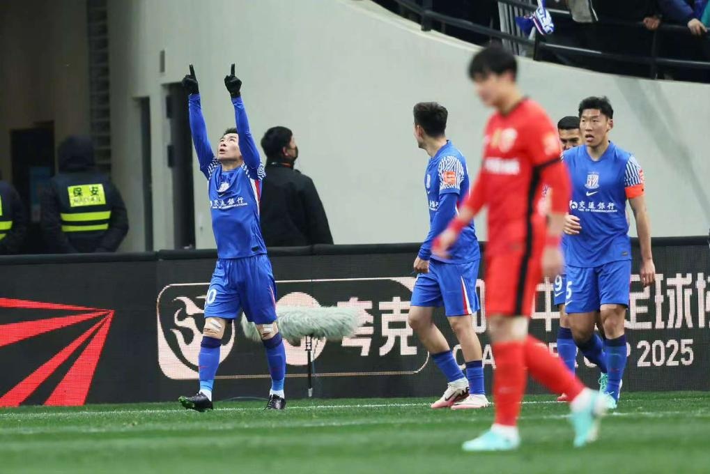 今年2月7日,上海申花队球员于汉超(左)在进球后庆祝。图片来自上海申花足球俱乐部官方微博