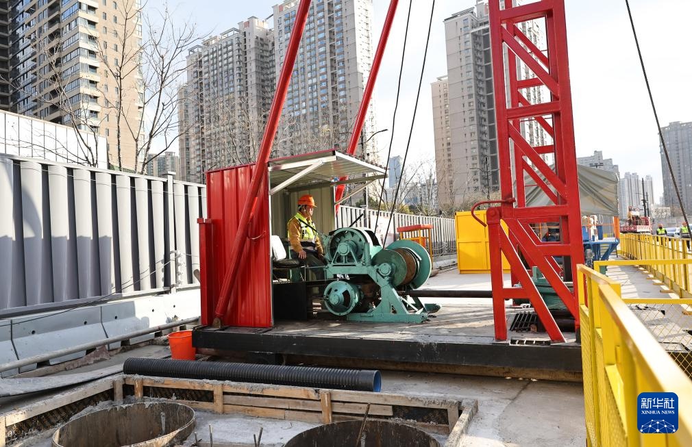 工人在南北通道浦西段四平路工作井施工现场调试运行工程机械(2025年12月30日摄)。新华社记者 方喆 摄