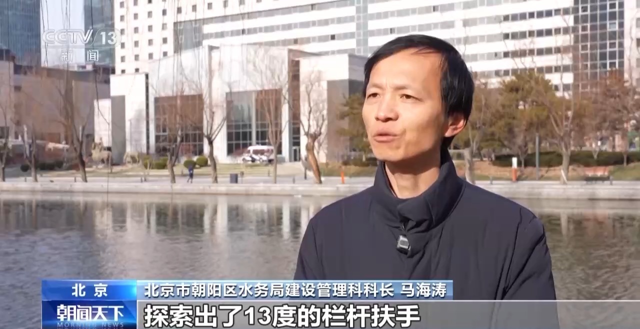 北京市朝阳区水务局建设管理科科长 马海涛:在整个滨水空间建设过程中,探索出了13度的栏杆扶手,这样人体手臂放在上面是最舒适的,以及45厘米高的座椅,都符合人体力学,打造非常舒适的滨水空间。