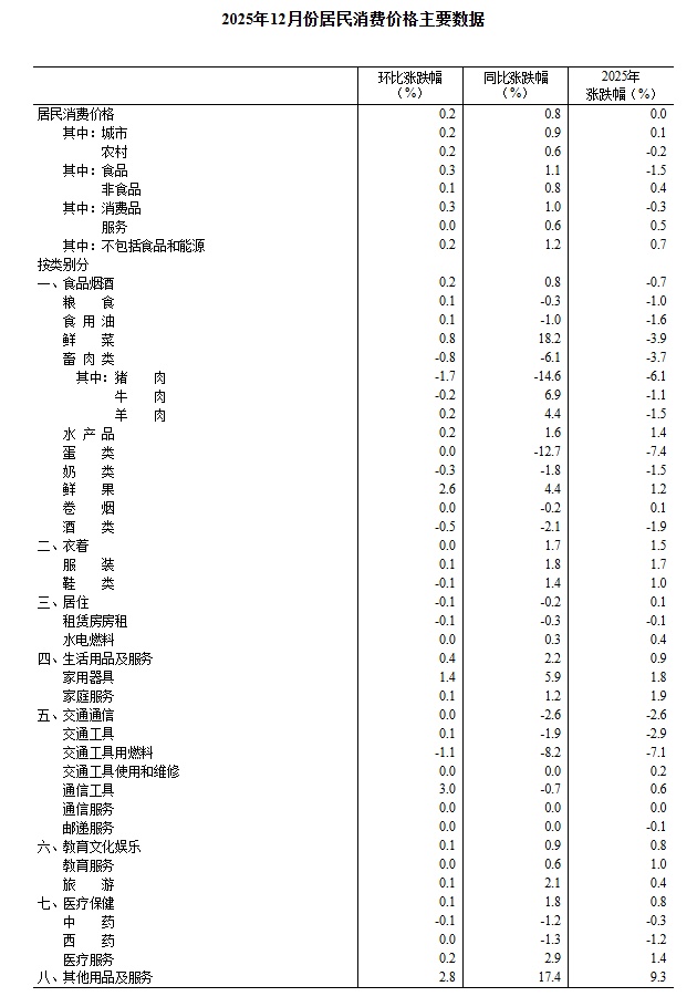 2025年12月份,全国居民消费价格同比上涨0.8%。其中,城市上涨0.9%,农村上涨0.6%;食品价格上涨1.1%,非食品价格上涨0.8%;消费品价格上涨1.0%,服务价格上涨0.6%。